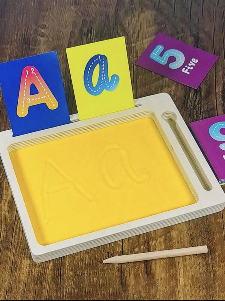 يحتوي على صحن خشبي ورمل اصفر وبطاقات متعدده للحروف والأرقام والكلمات الإنجليزية