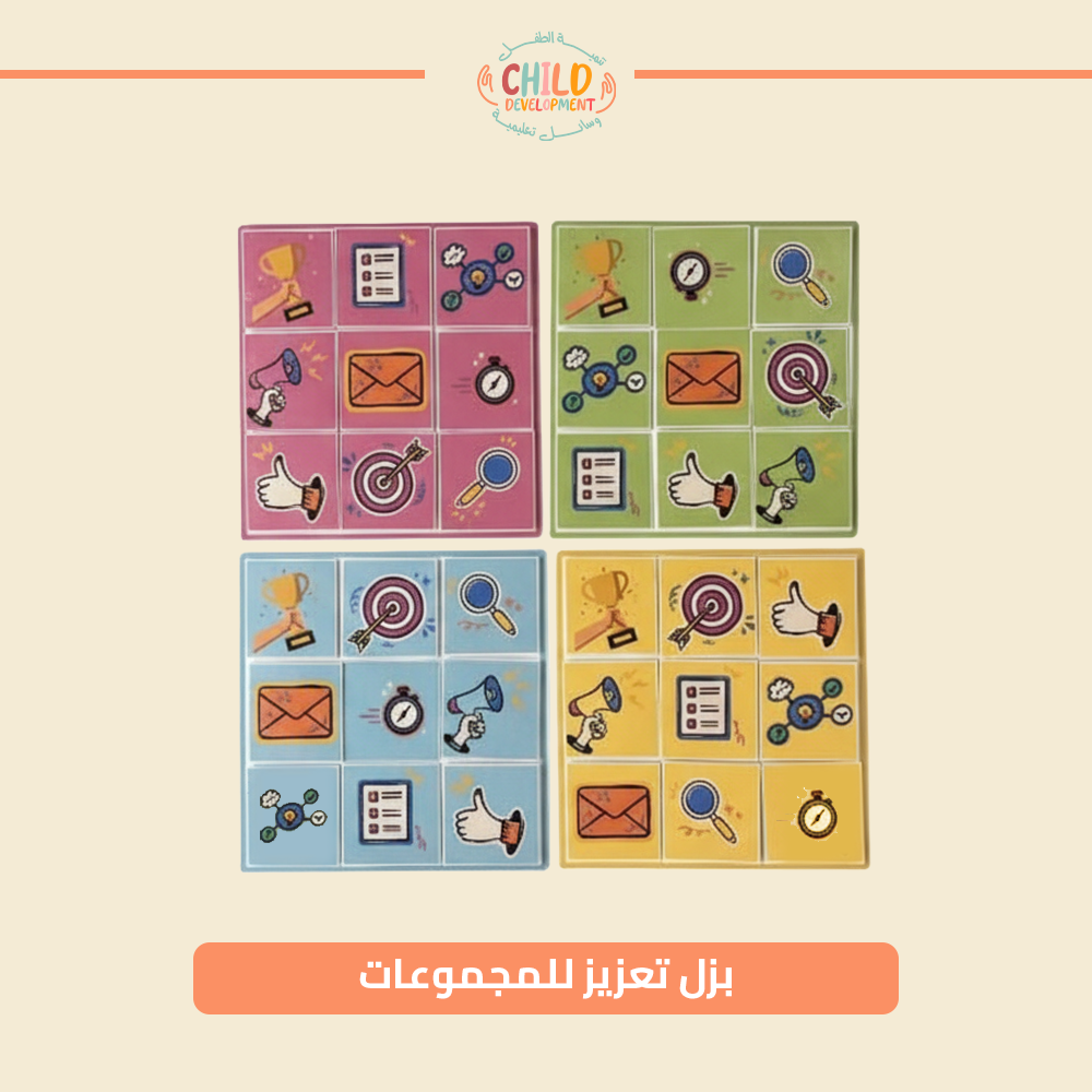 • خلف المربعات الكبيرة يوجد مغناطيس لتثبيت الاستراتيجية على السبورة.
